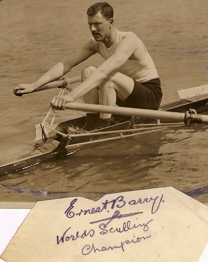 Today it is exactly one month since I started this blog on rowing history. To celebrate this I am posting a rare photograph of the English professional sculler Ernest Barry, with his autograph. Ernest Barry (1882-1968) was a professional waterman who won the Doggett’s Coat and Badge Race in 1903 and took the British Championship title in 1908 by beating George Towns of Australia.