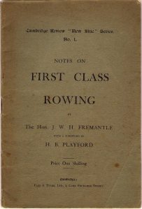 Notes on First Class Rowing by John Walgrave Halford Fremantle is a 21-page pamphlet published in 1921. (It was actually a reprint from The Cambridge Review of 21 and 28 October and 4 and 11 November 1921.) The titles of the different chapters are ‘Of the Beginning’, ‘Of Length and the Finish’, ‘Of Rhythm and the Swing Forward’, ‘Of the Racing Spirit’, ‘Of the Outside Hand, and more about the Finish’, ‘Of the Moving Slide’, ‘Of Bursting Yourself and Pinching the Boat’, ‘Of Swivel Rowlocks’, and, maybe a little odd, ‘Apology’ (apologising that there is actually not much new in these notes, “nor are they in any way complete”). Fremantle, later in 1956 to become the 4th Baron Cottesloe, 5th Baron Fremantle, was educated at Eton and Trinity College, and rowed for two victorious Cambridge crews in the Boat Race in 1921 and 1922.