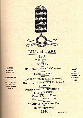 “THE START with WHERRY – good OAR d’Oeuvres NO CRABS included – soup TURN TURTLE – fish SOLES PRESSED (against the stretcher) – Cutlets supreme with CUTTERS (far astern) – NO FOWLS Pheasants with NO FEATHERING – THE STARTERS – Peches TO Melba – BEST and BEST BOAT Ice – Last Course – CHAMPION CHAMPIGNONS with a HARD ROW Over. Wines without Whines – Champagne – Real Pain for those on Fixed Seats Only – Port – Starting Always On The Port Side.”