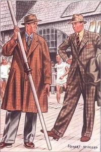 The second image (on the left) shows two well-dressed gentlemen in the foreground of a boathouse from which some oarsmen are getting ready to launch their shell. The man holding an oar is wearing an over-coat that I have not seen anyone wearing ever (is there in fact anyone wearing an over-coat these days?). The man on the right is dressed in a plaid suit that I would not dare to put on, just because I am not that brave. His suede shoes look elegant and do match his suit, though; I do have ‘the courage’ to wear suede shoes. I once bought a pair of brown suede shoes in Paris (together with a blue knitted tie, but that is another story). How I loved these shoes. It was only a couple of years ago I threw them out, although they were over-due long ago. The second image states who the artist is that did the illustration: Stewart Heidgerd. I googled him and saw that Heidgerd did art work for Esquire (which was first published in 1933), during the late 1930s, maybe even later.