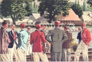 I am not really ready to let go of Tim Koch’s theme ‘rowing history and men’s classic clothes’ yet. You see, I happened to find two old images from the magazine Esquire on the web, that both are in a ‘rowing setting’. I do not know how old these pictures are, but I am guessing that they are between 50 and 70 years old. In the picture from the Henley Royal Regatta (at the top), we see some spectators (the course is in the background with some boats) dressed in bright-coloured jackets and the striped jackets that are all over this regatta still to this day. I do not believe, however, that you nowadays would ever see a visitor at Henley Royal wearing a brown-coloured plaid jacket like the fellow off centre to the right, nor, actually, wearing a brown hat of that fashion.