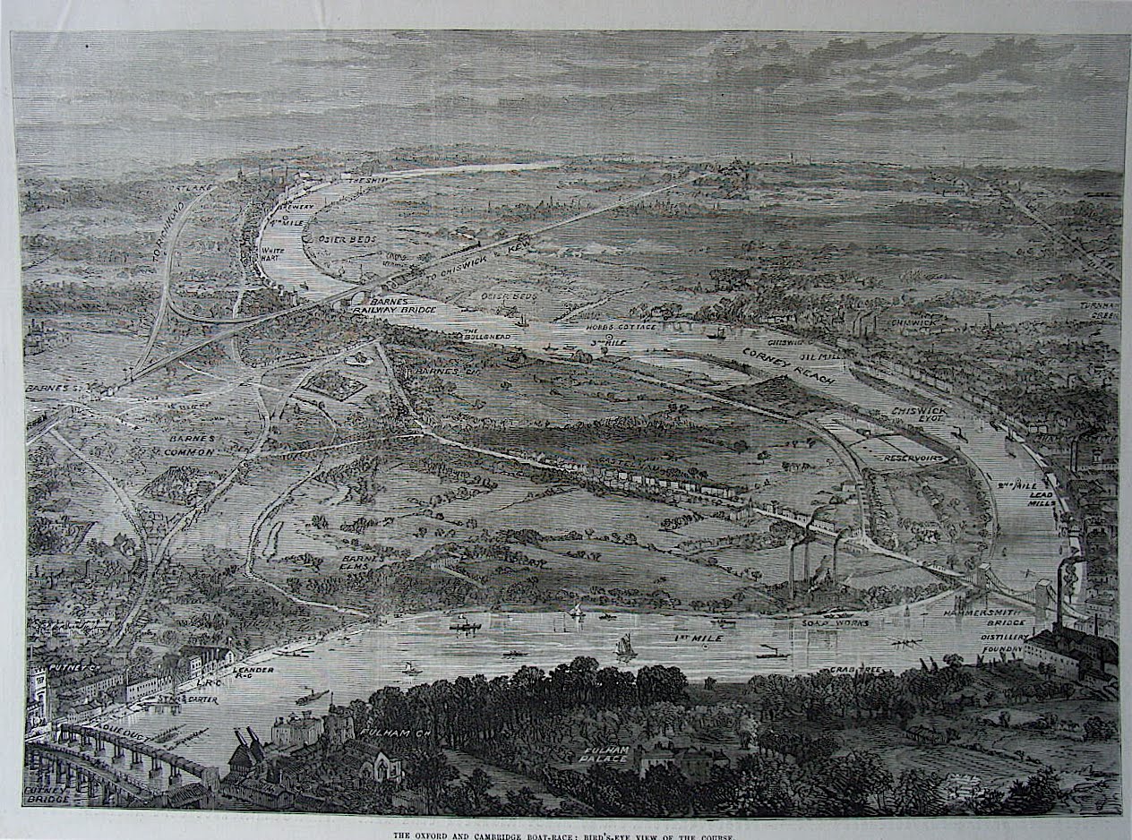 Tim continues, “The Boat Race always prompts me to revisit a favourite print from the Graphic magazine of April 1875. The ‘Champion Course’ (Putney to Mortlake or visa versa) is, naturally, little changed but the man made landmarks come and go. In 1875 the start had an aqueduct where Putney Road Bridge now is. Leander still had a Putney boathouse. The Surrey (port side) bank down to Hammersmith is still much the same. The Soap Works became Harrods Depository which is now converted to luxury apartments. The bridge is the old Hammersmith Bridge (1826-1886) which supported 12,000 people during the 1870 race. At Hammersmith (on the Middlesex or starboard side) the distillery, foundry, lead mills and oil mills are (thankfully) gone. At Barnes, the Surrey side is now built up but Middlesex retains more of its open spaces. At the finish there is no Chiswick Bridge (opened 1933) and the end is marked by the ‘Ship’ pub. Indeed, the pubs are the most unchanging landmarks. The aforementioned ‘Ship’, the ‘Bull’ at Barnes and the famous ‘Star and Garter’ at Putney all thrive today. The course is much like the sport of rowing – in some ways unchanging, in some ways always changing.”