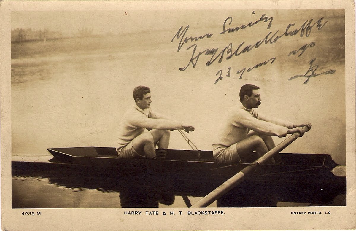 When I wrote about Harry Blackstaffe’s charming little drawing of a sculler after his name on the dinner list of the winners of the Wingfield Sculls in 1930, I could not remember where I had seen it previously. But the other day, when I was going through some old rowing post cards, I came across Blackstaffe’s signature again. Blackstaffe, or ‘Blackie’ as he was called, rowed and sculled for Vesta RC, and in the photograph above, we can see him together with Harry Tate in a pair. Looking in H. B. Wells’s Vesta Rowing Club: A Centenary History (1969), I can only find Blackie’s partner mentioned twice, in the Foreword, written by Thames RC’s Freddy Page, and by Wells, who writes, “The No. 2 in the crew was R. M. Hutchison, later a famous figure on the music hall stage under the name ‘Harry Tate’.” [p.5] But maybe that is not Blackie’s partner in the boat, although the name is the same. Anyone who knows?