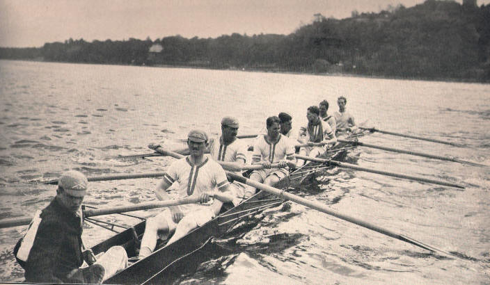 No. 6, Stanley Garton, is the famous ‘letter writer’ whom I have written about before. No. 2, Sidney Swann, is the only Cambridge man in the crew. Swann came from a rowing family. His father, Rev. Sydney Swann, rowed for Cambridge in the Boat Race in 1883-1885. According to Susan Saint Sing, in her The Wonder Crew (2008), when Sydney Swann Jr., entered Trinity Hall, he sent a letter to his father asking what he should do on his spare time? Swann Sr., sent him a telegram back with the short reply: “AT THE HALL, THEY ROW.” And so he did, becoming one of the greatest English oarsmen before the First World War.