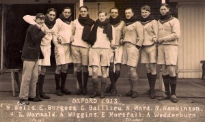 Here is a nice photograph of a relaxed Oxford crew of 1913. From the left: H. Wells (cox), E. Burgess, C. Baillieu, H. Ward, R. Hankinson, L. Wormald, A. Wiggins, E. Horsfall (stroke), and A. Wedderburn. On 13 March, these boys won the Boat Race, which has been described as “a most thrilling race”. After four winning races, Bob Bourne was not stroking anymore, nor was his father, Dr. C.G. Bourne, the coach for the dark blues. But they did not lack experience. Wells and Wormald had won the Boat Race also in 1911 and 1912, and both Wedderburn and Wiggins in 1912. That latter year, Wells, Burgess, Wormald, and Horsfall had won an Olympic gold medal in the eights at the Games held in Stockholm (rowing for Leander).