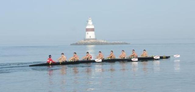 The Crimson Knights rowing to Fishers Island. From bow to stern: William Solberg ’11; Tim Smith ’10 (Northeastern); Bert Harney ’10 (Cornell); Grant Barnekow ’10 (U Cal Berkeley); Patrick Grogan ’10 (Trinity Dublin); Josh Weinstein ’11; Kyle Good ’10 (Cornell); stroke Emery Schoenly ’10 (Yale); cox Bryan Wong ’10 (NYU). Photograph: Tony Tremaine, Salisbury captain ’66.