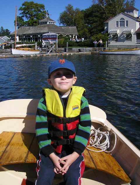 At the Boat House, two nice ladies suggested a fine looking, sleek ‘skiff’ with the name Captain Hook. Anders immediately liked the name, being interested in pirates and recognising the name from Peter Pan. I put Anders on the stern thwart, put the rowlocks in the holes of the gunwales, the oars, without buttons, (collars), went in the rowlocks, and we were all set. One of the ladies gave us a gentle push and we were out on the Mystic River. It was really a nice day, and I was surprised by how few boats were out on the river. After a while I even got used to sitting still, having no sliding seat to help me get longer strokes. Anders was a good look-out and told me ahead of time when the steamboat Sabino was approaching her dock after she had been downriver by the drawbridge in downtown Mystic.