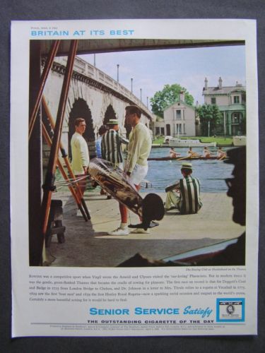 The ad is for “the outstanding cigarette of the day” Senior Service, launched in Great Britain in 1925, which was named after the nickname of the Royal Navy. What I find interesting with this ad is that it gives you some rowing history facts of British rowing. Among other things you can read:
