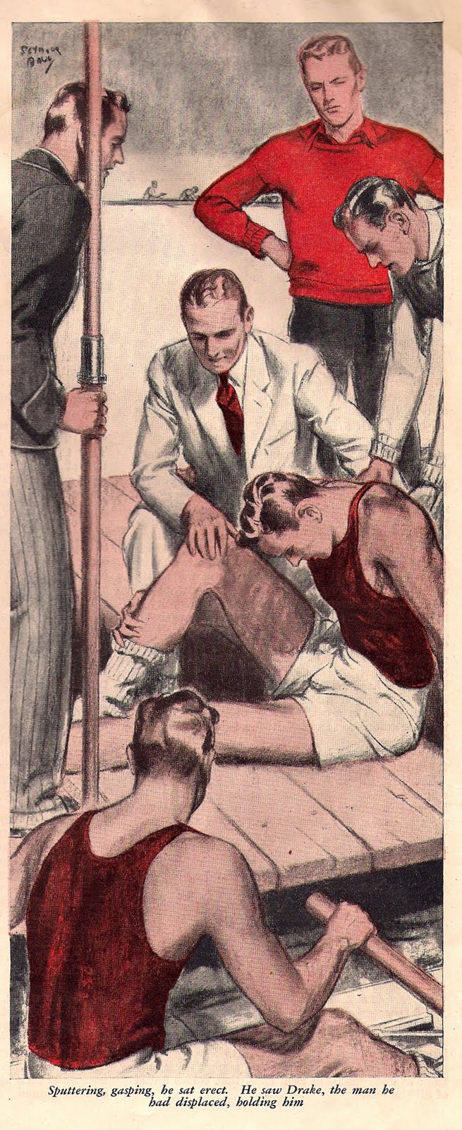 In the June 1932 issue of the magazine Boys’ Life, published by the Boy Scouts of America is a short story by Philip Scruggs, “The Kings Navy”. It is one of these rare sports stories where the athletes are oarsmen, rowing for King’s College. The story is very 1930-ish, of course, but I am somehow impressed by Scruggs’s knowledge about the sport of rowing. And added to my liking is illustrator Seymour Ball’s drawings (both being shown on top and on the right). I am afraid I do not have any information about the writer Philip Scruggs or the illustrator Seymour Ball. You will, however, find a list of Scruggs’s stories between 1928 and 1935 by clicking here.