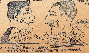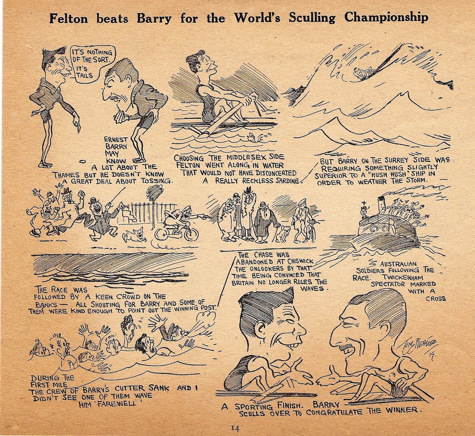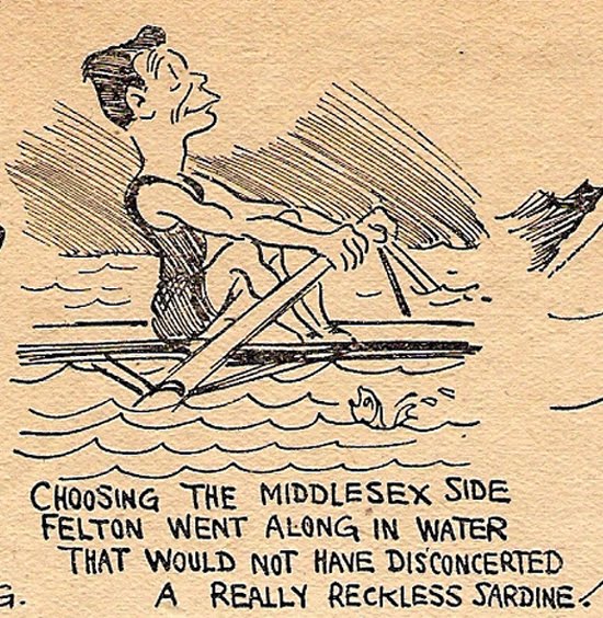 On 27 October 1919, for £500 a-side, World Champion sculler Ernest Barry lost his title to the Australian Alfred Felton on the championship course between Putney and Mortlake. This was captured by Tom Webster, who was a cartoonist at the Daily Mail (see above and below). Almost a year later, 28 August, 1920, Barry took back the Champion title from Felton on the Parramatta River. Barry’s trip to Australia to regain the World title was made possible thanks to Webster’s newspaper. The Daily Mail started a public subscription to fund the Englishman’s voyage, which was going to cost £2,000 (£500 stake money and £1,500 for expenses). In his Sculling and Skulduggery Stuart Ripley claims that more than 100,000 people lined the Parramatta River for the race. After the race Barry retired from professional sculling.