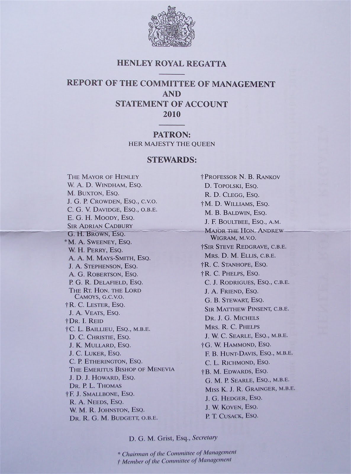 The 56 Stewards for 2010 are listed on the front of the report (including the late Hart Perry) and the twelve names marked with a cross or asterisk are members of the Committee of Management who undertake the planning and detailed organisation (double click on the pictures to read). They are listed in order of their appointment and are mostly accomplished rowers and scullers but they also include some long serving and successful administrators of the sport. It is their accumulated knowledge and experience that makes Henley a competitor’s regatta rather than a social event first and a rowing event second. Unfashionably, the Stewards are a self-electing body running a self financing regatta. As no sponsorship is required or sought, we are unlikely to see the ‘Ronald McDonald Royal Regatta’ at any time in the near future.