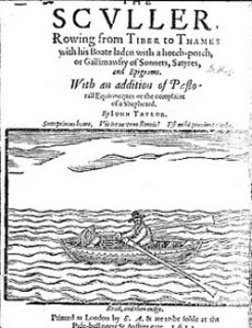 The reason John Taylor is brought up in HTBS is that most of his life, he was a Thames waterman, working hard for the watermen’s right, and, of course, writing about them, but also, mostly about himself. When he became one of the King’s watermen, Taylor also proclaimed himself the King’s own water poet, and he became somewhat famous after publishing his The Sculler, in which he writes,