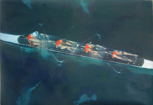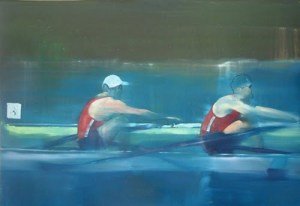 British painter Nick Archer, born 1963, has been working on a sporting themes for some time, mainly based on film footage from the 2008 Olympic Games. He has actually worked with imagery of swimmers, cyclists and horse racing as well as rowing. “The main interest for me was to capture the movement, energy and atmosphere of the events”, Archer says.