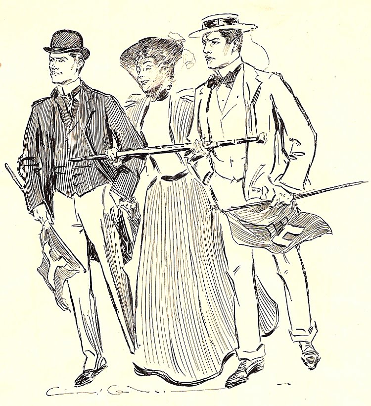 Gibson’s illustration on top is called ‘The Coach’, while the illustration of the Gibson girl happily walking between the two Yale and Harvard rivals is called ‘Going to the Race’.