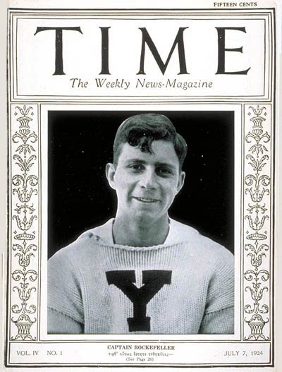 Central waiting room and put on a truck and taken directly to the ship’s side of the Homeric and swung on board and lashed down in the bow of the ship covered only with canvas. The Party making the trip consisted of one Rowing Committee member who held the letter of credit, [Yale rowing coach] Ed Leader, [boat builder] Dick Pocock, [assistant coach] Sid Coe, the nine of the crew, a substitute coxswain and four substitute oarsmen, the manager and an assistant manager. Our accommodations were scattered through the first-class of the Homeric. Four rowing machines were screwed into the boat deck where one of the life boats was swung over the side and we had two hard workouts a day on the rowing machines in addition to doing calisthenics. Gloria Swanson [seen on the left] was on board but was not in our party.# Our captain [James Rockefeller, who made the cover of the Time Magazine on 7 July 1924, seen on top!] met his wife on the boat and between these two extremes various other possibilities were considered.