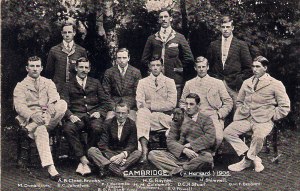 The Cambridge crew which met Harvard in a race on the River Thames on 8 September, 1906. Standing, from the left: A.B. Close-Brooks, H.G. Baynes, and H. Shimwell (substitute); seated: M. Donaldson, B.C. Johnstone, F.J. Escombe (coach), H.M. Goldsmith, D.C.R. Stuart, and G.H.F. Benham; seated in front: B.G.A. Scott and R.V. Powell.
