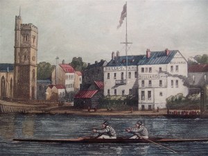 Some delightful evidence that Putney was an established centre of amateur rowing by the late 1840s is given by four engravings published on 25th January 1851 ‘by Messrs. Fores at their Sporting and Finest Print Repository and Frame Manufactory, 41 Piccadilly’ showing various types of rowing boats along the Embankment. My favourites show an ‘outrigged pair’ by St Mary’s Church (seen above) and the old bridge and a ‘Funny’ (inrigged scull) by the ‘Star and Garter’.