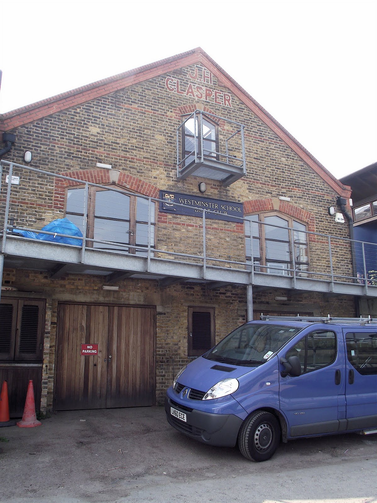 The only Victorian boathouse not yet mentioned that still stands on the Embankment started life slightly differently. What is now Westminster School Boat Club was erected by the boat builder, J.H. Clasper, I think in the 1880s. John Hawks Clasper (1835-1908) was the son of the famous and innovative Newcastle boat builder, oarsman and coach, Harry Clasper (1812-1870). John moved south in the late 1860s and by the 1870s was building boats in Wandsworth (just upriver from Putney) and in Oxford. Many of the boats used in the Oxford-Cambridge Boat Race in this period were made by him. The first reference that I have of him as ‘Clasper of Putney’ is 1882 when he ‘steered’ Payne in the Wingfield Sculls from a following boat. Between 1887 and 1897, ‘Clasper of Putney’ again built many of the craft used in the University Boat Race. The original building has been thoughtfully and ‘lightly’ adapted for modern use by WSBC and the name ‘JH Clasper’ is still nicely picked out in red brick on the gable end (see above and on top).