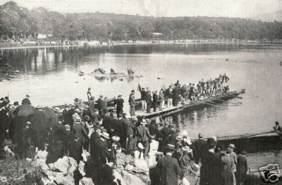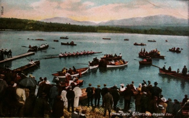 The postcard on top was posted in 1906 and the description on the left of the card is “Lower Lake – Killarney – Regatta Day”. Killarney has a rowing tradition dating back to the early nineteenth century. The local clubs race each other in fixed seat ‘sixes’ and ‘fours’ and the rivalry goes back generations. The picture is certainly not the traditional Killarney regatta. On closer inspection you will see the crew leaving the slip is actually an eight, and is in fact the Penn crew setting off to the start for their race against their Dublin challengers.