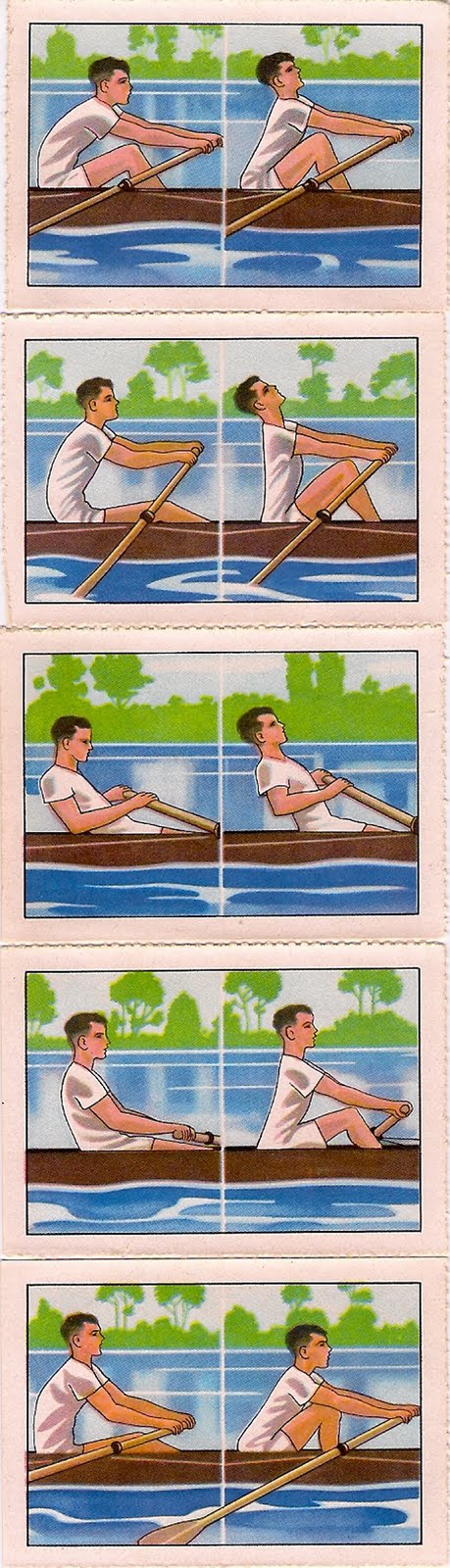 Two weeks ago, I won some premium cards on eBay. It was, I believe, a full set of Nestle’s Rowing style sport cards from 1938, the same year the famous rowing coach Steve Fairbairn died. The cards on the left, five out of a total of 12, show the Fairbairn ‘style’ (on the left) v. the old Orthodox style (on the right).