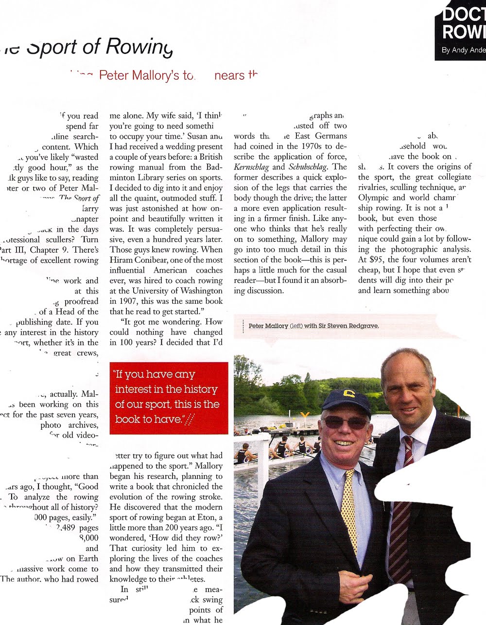 My fellow-director of the Friends of Rowing History, Peter Mallory, is getting good coverage in the current issue of Rowing News, Vol. 18, issue 5, July 2011. It is ‘Doctor Rowing’, Andy Anderson, who writes about Peter and his Magnum opus, The Sport of Rowing, which is to be published later this year. The collector’s edition (250 copies a $300 a pop) has already sold out, so everyone who is interested in this four-volume, 2,500-page book has to do with the ‘trade edition’ for measly $95. Large parts of Peter’s book have already been published on the web, but that doesn’t seem to stop rowers from pre-ordering the book. It is the River and Rowing Museum which is going to publish it. I have to say that I admire Peter, not only for doing research, writing, but also promoting the book. It is easy to blow out all your candles during the two first steps, and to keep at it, also during step three, can be hard. But Peter has done a tremendously good job getting the word out about his book, and that is paying off right now. Good luck, Peter, with the book!