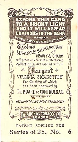 You will constantly find old cigarette and tobacco cards for sale on eBay. The one above (which, however, is rare on eBay) was issued by Bocnal Tobacco Co in the U.K. in 1938 and comes from a set entitled Luminous Silhouettes of Beauty + Charm and measures 2.7 by 1.4 inches. It is No. 6 in a set of 25 other sport ‘glowing cards’. Below you can read on the back of the card that if you hold the card under a light it will glow in the dark, which it still does although it is more than 70 years old.