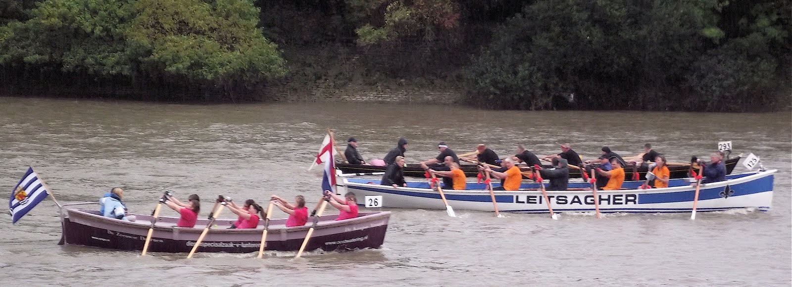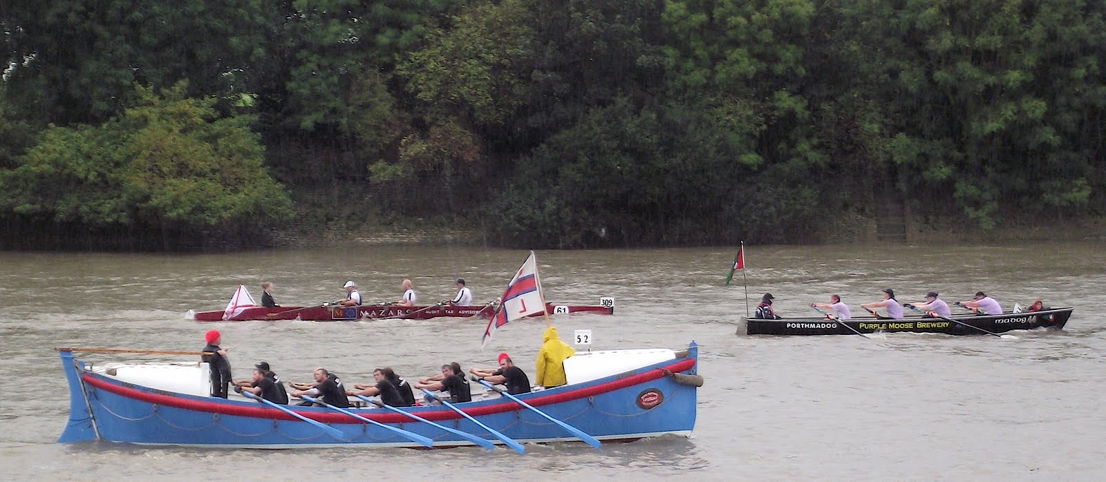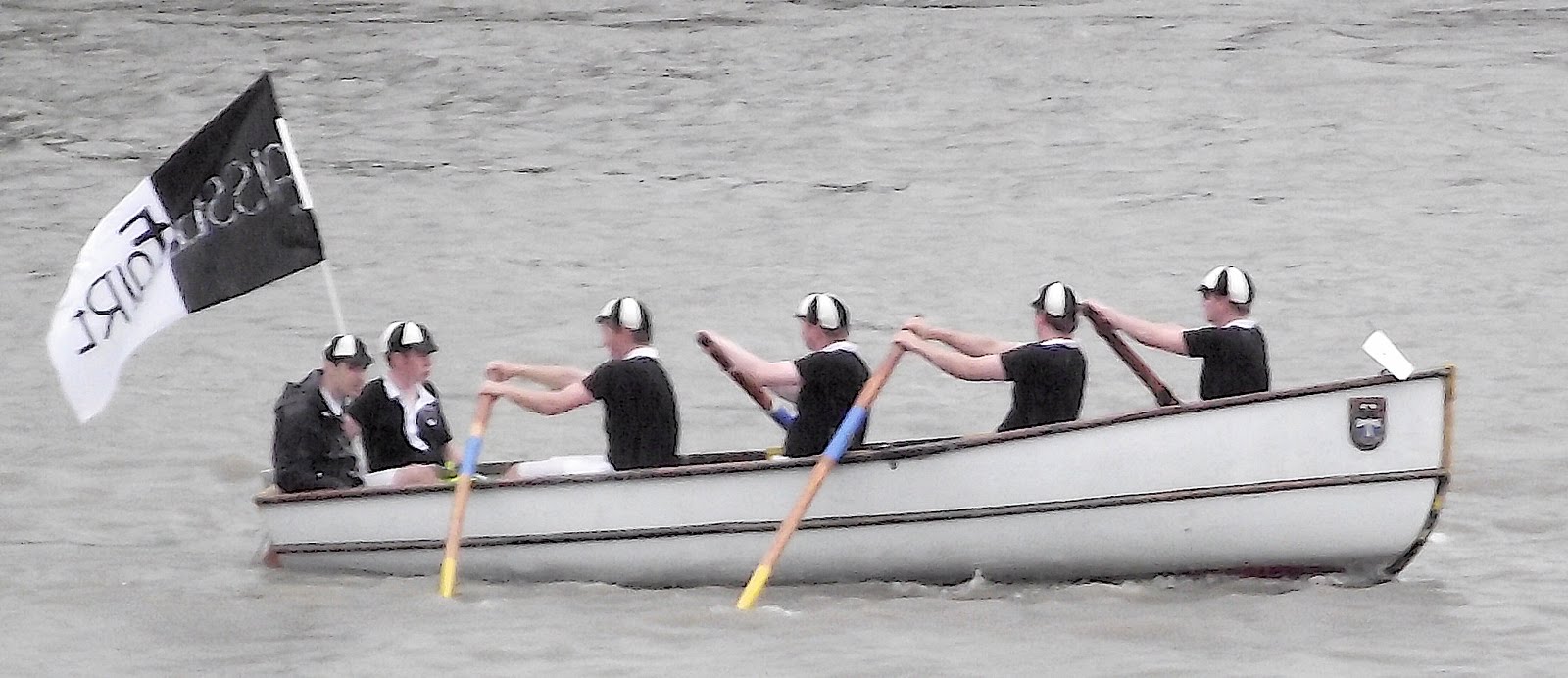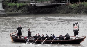 This year over 300 boats took part. The rules of the race say that the boats must be rowed, sculled or paddled and most boat classes must carry a coxswain plus a passenger (who may take turns at the oar or paddle). The ‘passenger rule’ comes from the Watermen’s historic responsibility to carry passengers on the Thames (small children are often favoured for this role). Also, no sliding seats or riggers are allowed and each boat must fly a flag. The huge variety of boats that take part (gigs, cutters, currachs, dragon boats, skiffs, whalers, and longboats to name some) coupled with the inclusive atmosphere of the event which attracts men and women, the young and the old, the competitive and the leisurely, mean that there are thirty five trophies on offer including one for ‘sportsmanship’ and one for ‘endeavour’, that is the most effort displayed by a junior crew.