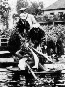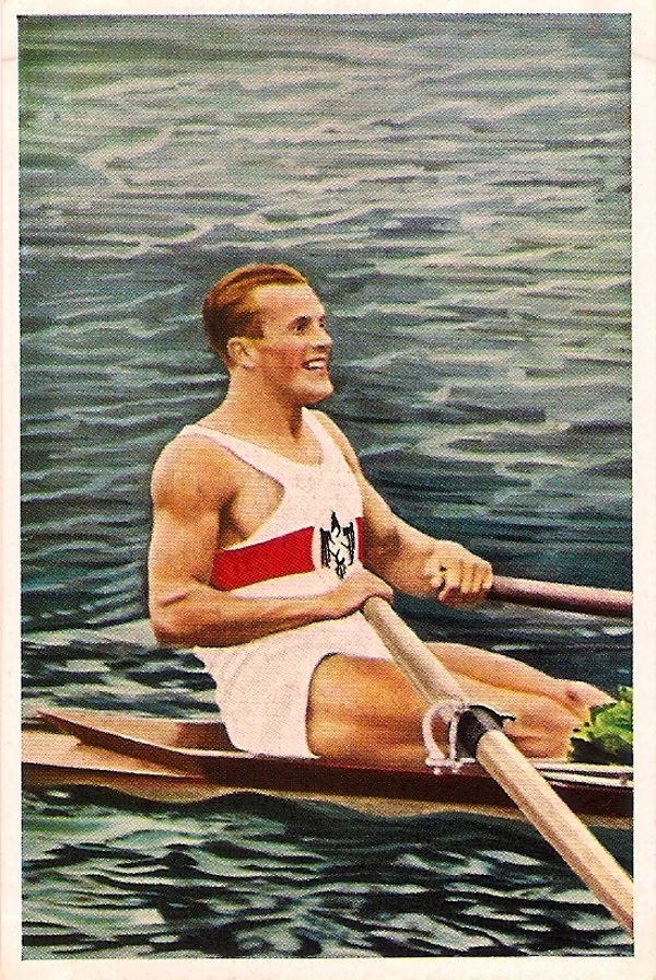 The following year, ‘Gummi’, failed to defend his German title against Buhtz, but beat Buhtz at the 1936 German Championships and was selected to represent Germany in the single at the Olympic rowing event in Berlin. In the final, Schäfer did not have any problems winning the Olympic championship title with a couple of lengths ahead of Josef Hasenöhrl, Austria, and Daniel Barrow, USA. The favourite before the race, Ernst Rufli of Switzerland, Diamond Challenge Sculls winner both in 1935 and 1936, finished fifth. Here is a short clip from the single scull final (please, turn off the sound to get rid of the very annoying music):