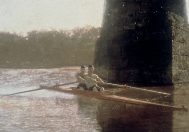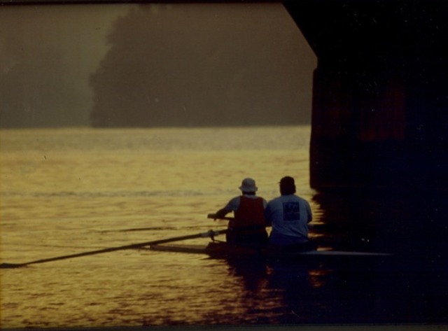 Yesterday, rowing historian Bill Lanouette sent me a photograph (see above). At first, I thought it was the famous Biglin Brothers rowing a pair under the bridge on the Schuylkill . But how could that be, as Bill said it was a photograph taken by Joel Roger showing Bill and his rowing buddy Chuck Levy rowing under Key Bridge on the Potomac? Well, there are for sure some similarities, don’t you think? (see Thomas C. Eakins’s painting of the Biglin brothers below.)