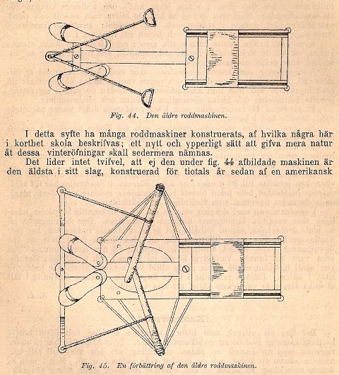 After the two last days’ posts about rowing machines, rowing barges, rowing tanks, and ‘dry’ tank rowing, I would like to wrap up the subject for this time with some images of old rowing machines. The two machines above are from the same 1887 Swedish sport book as featured in the Thursday post. The very simple machine on the very top has no ‘oars’ just rubber straps to pull on. According to the text in the book that machine was constructed ‘a couple of decades ago by an American oarsman’ [my translation]. The other image is showing an improved version of the older one by attaching the rubber straps to two sculls, much like the ones shown in Tim Koch’s Thursday post. A funny note regrading rowing on rowing machines, in the Swedish book, this is called ‘Kammarrodd’, that is, ‘Chamber Rowing’.