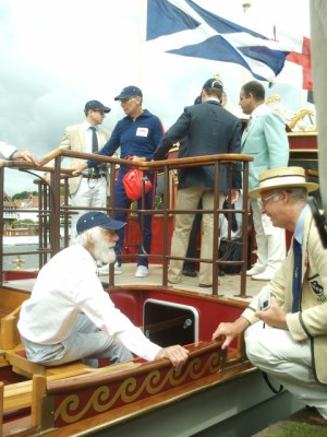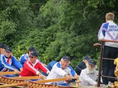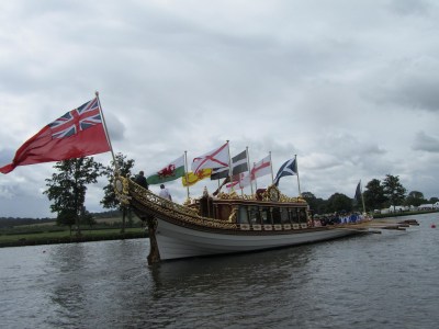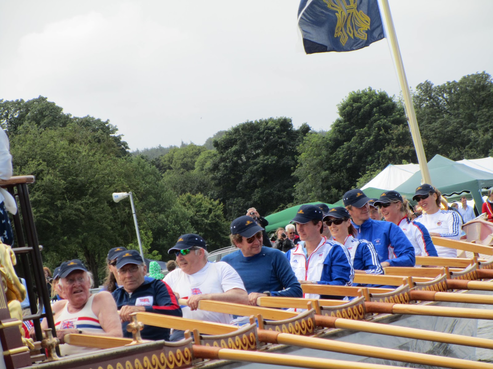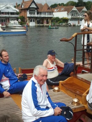 At 11 a.m. on Sunday, 1 July, the day of the Finals at the Henley Royal Regatta, 18 former Olympians representing Great Britain between 1948 and 2008 rowed the royal barge the Gloriana, which was the lead vessel at the Diamond Jubilee Pageant last month, past the regatta’s spectators. They were a great attraction on the river. A few members of the press have been invited to follow the row-past, being a good film and photo opportunity. My film and photographs can be seen above and below.