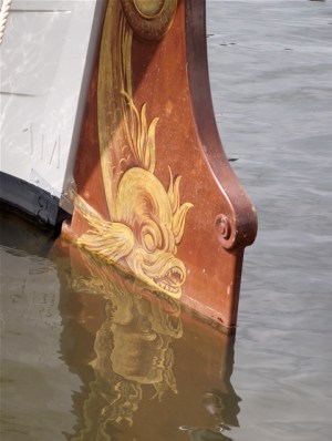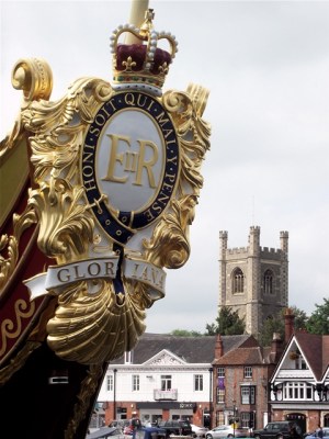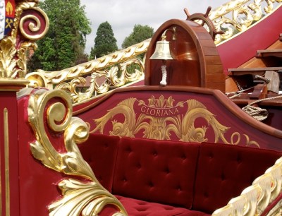 HTBS has previously reported on the Gloriana, the 18-oared, 88 foot / 27 metre ‘rowbarge’ produced for the Queen’s Diamond Jubilee Celebrations. While it looks magnificent from a distance, it is only close up that one can fully appreciate how it cost £500 000 / $785 000 and why £4000 / $6300 was spent on gold leaf. At this year’s Henley Royal Regatta, the Gloriana was moored at the pontoon and boat tent area for everyone to see.