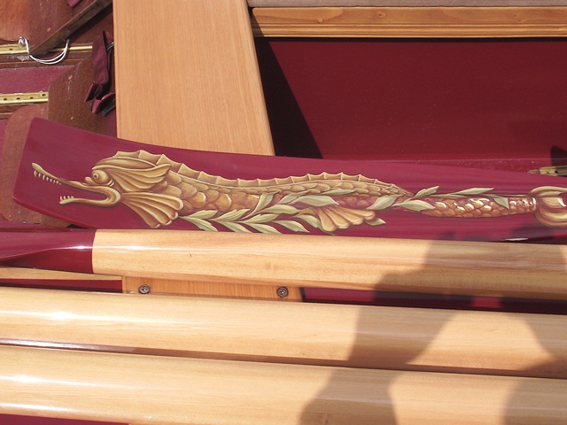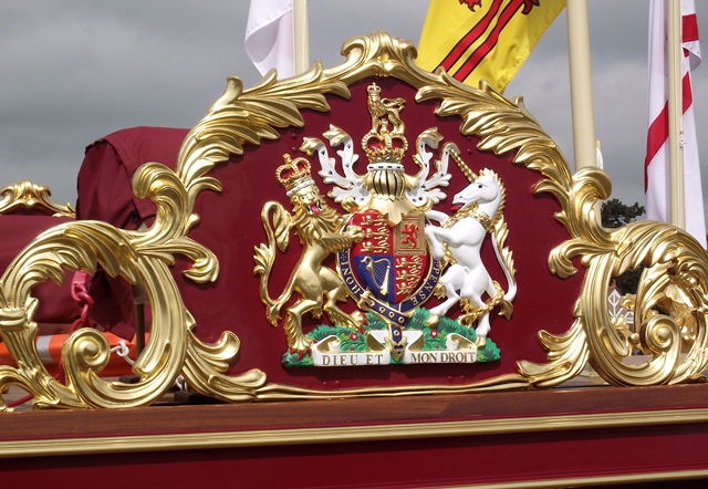 HTBS has previously reported on the Gloriana, the 18-oared, 88 foot / 27 metre ‘rowbarge’ produced for the Queen’s Diamond Jubilee Celebrations. While it looks magnificent from a distance, it is only close up that one can fully appreciate how it cost £500 000 / $785 000 and why £4000 / $6300 was spent on gold leaf. At this year’s Henley Royal Regatta, the Gloriana was moored at the pontoon and boat tent area for everyone to see.