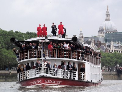 The launch from the Watermen’s Company follows the race. The man in blue coat and badge is the new Watermen’s Bargemaster, Scott Neicho. St Paul’s Cathedral in the background.