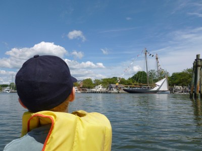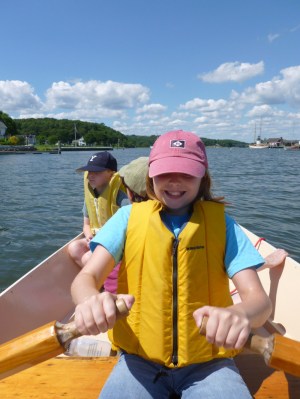 Yesterday, however, was a perfect day for an outing on the Mystic River with the family. It was not too hot, we launched the boat when it was high tide, and I had borrowed half a foot longer oars, which did the trick. We got a nice voyage on the river, although our son, Anders, after a while complained that he was bored. Just the other day, he had learned how to ride his bicycle without the ‘training wheels’, so he was more eager to ride his bike than being out on the river. Our daughter Ingrid was, however, more than willing to have a go at the oars. She did very well; I see a rowing scholarship at an Ivy League school coming her way…