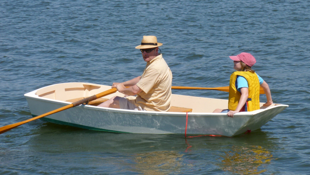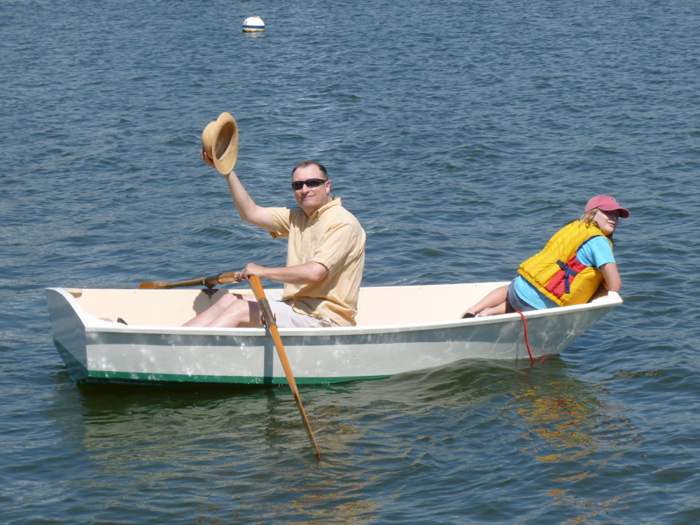 It was the WoodenBoat Show at Mystic Seaport some weeks ago, and there I happened to meet my friend Bill, who is a rower, too. When he heard that I was looking for an old wooden boat, he said he had just the one for me in his backyard. Now, not only is Bill a nice person and a rower, but also a boat builder. He has built kayaks, sailboats, and rowing boats. Bill said he would happily have me take over the first boat he ever built, thirty years ago, a 10-foot pram designed by the famous American boat builder John Gardner. I immediately agreed to take a look and to try out the boat.