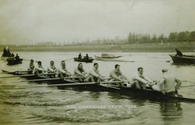 At Putney Bridge on 4 April, at precisely 3.30 p.m. he sat in the two seat of the University eight for the annual Boat Race against Oxford. Cambridge, although hot favourites having won the two previous encounters, did not draw away until after Barnes Bridge to win by two and a half lengths, in 19 min. 20 sec. The Tideway course, rowed against the stream, is one of the most gruelling sporting events in the world. The New York Times reported that ‘the Oxford men who had gamely rowed a losing race were much distressed at the finish’. In his blue blazer at dinner on that triumphant night in 1908, he would have been as peripatetic as a newt.