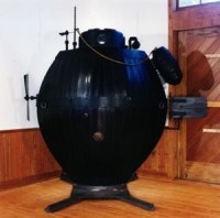 David Bushnell (1740 – ca. 1826) of Saybrook built the first practical submarine, which was the first used to attack a ship, and the engineering aspects of The Turtle (on the right) are simple and neat enough that particularly families with children might enjoy the full-size replicas at the Submarine Force Museum at Groton and the Connecticut River Museum at Essex, at which there are of course many other things for you all. Take a closer look at the Submarine Force Library and Museum and Connecticut River Museum and The Turtle.