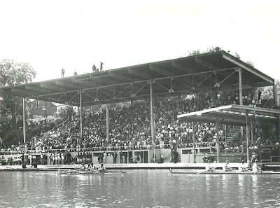 On 9 August, HTBS posted some lovely old photographs from the 1948 Olympic Rowing Regatta held on the Henley Royal Regatta course. Or so I thought. HTBS received a kind e-mail from Andrew W. where he writes about the photograph of the grandstand and press box: “I think the one of the Grandstand is actually on Martindale Pond, at the Royal Canadian Henley Regatta (St Catharines, ONT).” Andrew also gives a link to a more recent taken photograph of the grandstand and press box – wonderful photograph, by the way – have a look here.