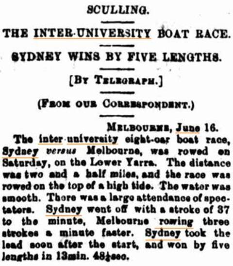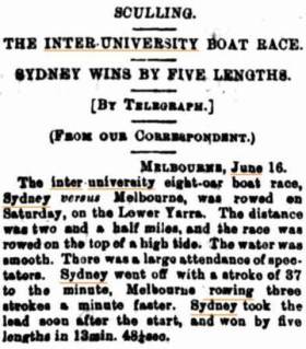Adelaide achieved its first win on 21 December, 1889, at their home course on the Port River, and again in 1896. Sydney’s first win was on 16 June, 1890, by five lengths. Here is a short note about the race in a newspaper: