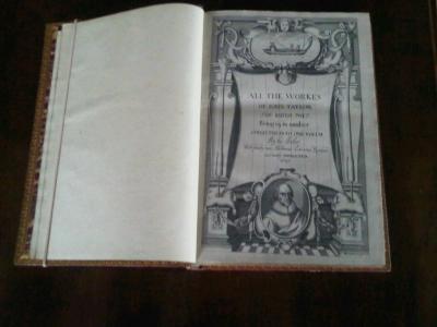 Amongst the rarest in Tom’s collection are the works of John Taylor, the Water Poet – “Collected into one volume by the Author. With Sundry new Additions, Corrected, Revised and Newly Imprinted” printed in 1630. John Taylor was a ferryman and poet well known to, but looked down on by the Elizabethan literati: works include “A Very Merry Wherry-Ferry-Voyage”, “The Sculler”, and “A Discovery by Sea, from London to Salisbury”.