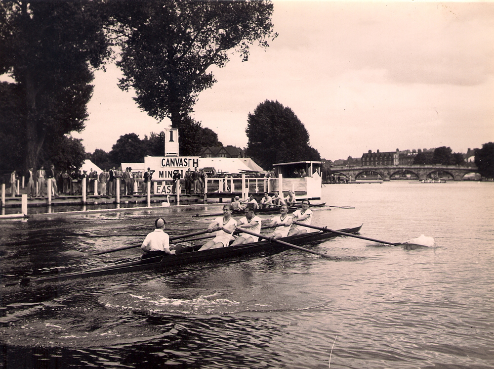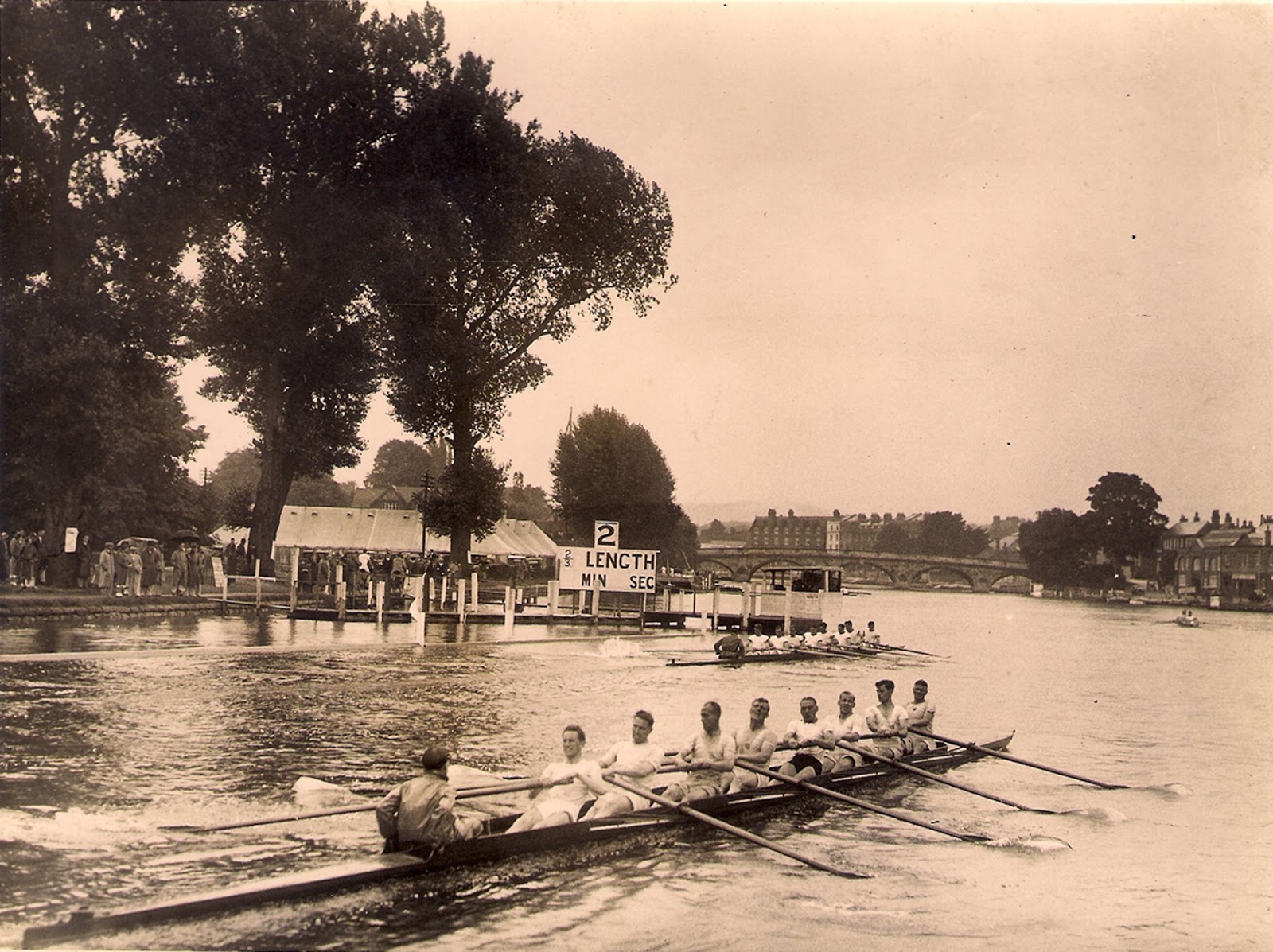 I suspect the photo was taken at the NARA Championships, which for some years in the 1930s was held at Henley a week after the Royal Regatta. The HRR Stewards used to leave the booms in place for the NARA Championships. You can see the booms in the photo.