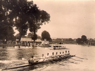 This is Henley. The bridge on the right and the Leander clubhouse peeking over the boat tents are quite identifiable. As Clapton Warwick (1877) and (presumably) Nottingham Britannia Rowing Club (1869) were tradesmen’s clubs I think the regatta must be Henley Town and Visitors’. This was the ‘Henley’ for men who worked with their hands and so were not (until 1938) classed by the Amateur Rowing Association as amateurs. Henley T and V is still going today and their website gives a brief history and some videos of recent regattas.