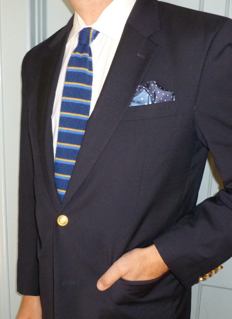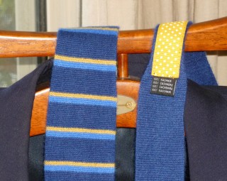 So, not only can you be a reader of HTBS, you can be a handsome readers of HTBS. The HTBS tie, which is designed by Tim Koch, has a navy-coloured base with two horizontal stripes in light blue and yellow, which will go nicely with a white or a multi-coloured shirt, together with your blazer, or sport coat. The narrow part of the tie is in plain navy, and the tie has a grosgrain ribbon, in yellow with white dots, which stops it from sliding around under your collar.
