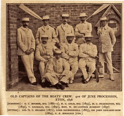 The above photograph originally appeared in Vivian Nickalls’ autobiography Oars, Wars and Horses which was published in 1932. It reappeared on page 50 in Peter Mallory’s epic 2,500 page The Sport of Rowing in 2011. Colonel F. C. Ricardo is seated left, beside him, Tom Bunbury (Lord Rathdonnell) is seated center, being the elder “Captain” with his son Billy standing on the right. Unfortunately, there appears to be two errors in the caption both of which relate to the Bunburys. The Eton Registers published in 1901 and 1906 list Tom as Captain of the Boats in 1868 (not 1863) and J. L. Philips as Captain of the Boats in 1897 and not Billy. It is still a wonderful picture and I am very grateful to Peter for the scan of the photograph.