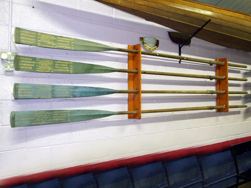 Four of the seven McClintock-Bunbury oars on display in Carlow Rowing Club.