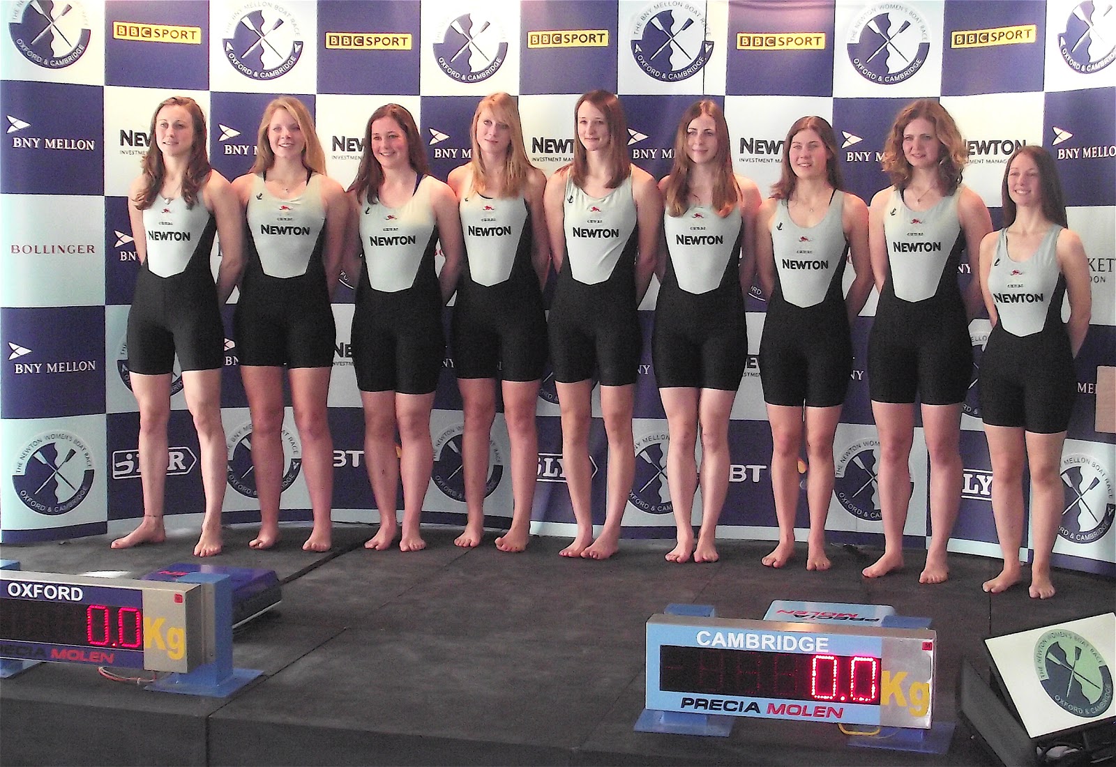 Tradition was broken at the weigh-in and crew announcement for the 2013 Oxford-Cambridge Boat Race held in London on 4 March. As the Women’s Race moves to parity with the men, starting with equal funding and culminating in the move of the Heavyweight Women’s Race to Boat Race Day proper on the Tideway in 2015, the girls joined the boys for the mildly humiliating ritual of parading around in Lycra in some unlikely non-rowing context – the City offices of sponsors BNY Mellon in this case. I hesitate to speculate about how even obviously physically fit and highly toned women felt about being weighed in public but they did look a little nervous as they filed in to meet the waiting press.