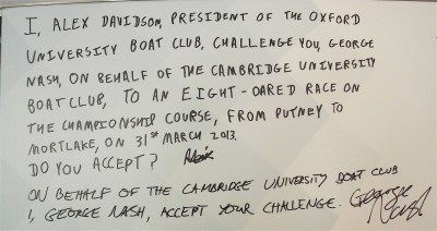 The traditional challenge from the President of the previous year’s losing boat club to his counterpart in the winning club. Joined up writing seems optional.