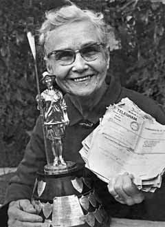 Dorothy Arnold holding the trophy modeled on her at the time of winning the first race.