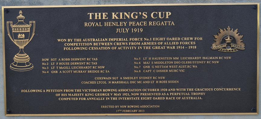 My good friend Barry Moynahan led a working group to commemorate the King’s Cup. It was installed at the SIRC course at Penrith and unveiled at a moving ceremony on Sunday, 17 February during the 2013 New South Wales Rowing Championships.